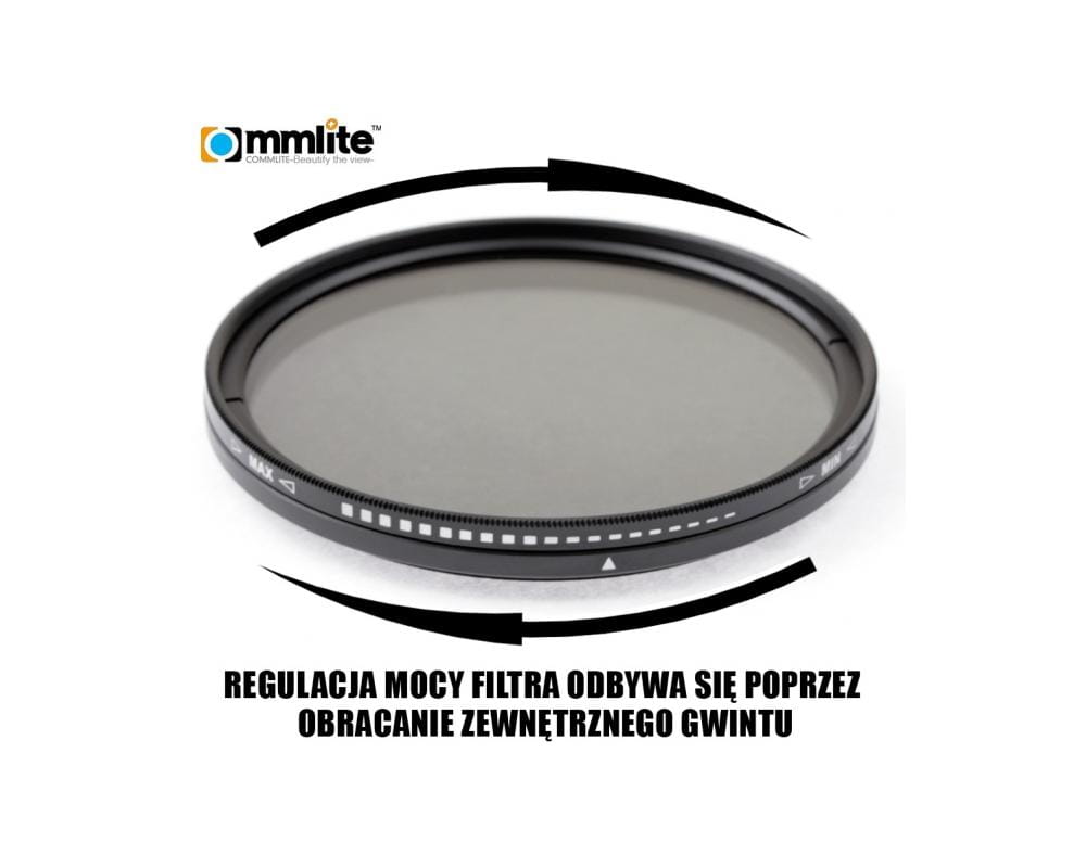 COMMLITE ND FADER to filtr szary pełny z możliwością płynnego przygaszania w zakresie 8 działek przysłony (NDx2-NDx400). Zmiana przyciemnienia odbywa się poprzez przekręcanie frontowego pierścienia filtra. Konstrukcja filtra to dwa, wysokiej klasy filtry polaryzacyjne-liniowe, które poprzez przekręcanie wobec siebie, zmieniają polaryzację. Wynikiem tego zjawiska jest odcięcie mniejszej, lub większej części światła wpadającego do obiektywu.