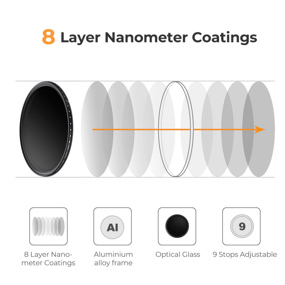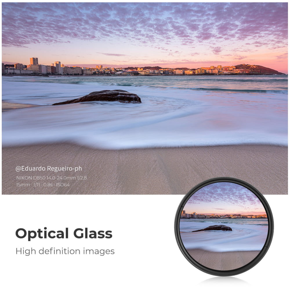 Sercem filtra jest wysokiej jakości optyczne szkło HD, które gwarantuje nieskazitelnie czyste i wyraziste zdjęcia. Możliwość płynnej regulacji gęstości w zakresie od ND2 do ND400 pozwala zredukować ilość światła docierającego do matrycy, nie wpływając przy tym na kolorystykę obrazu. Dzięki temu możesz tworzyć wyjątkowe kadry, zachowując naturalną paletę barw fotografowanych obiektów.