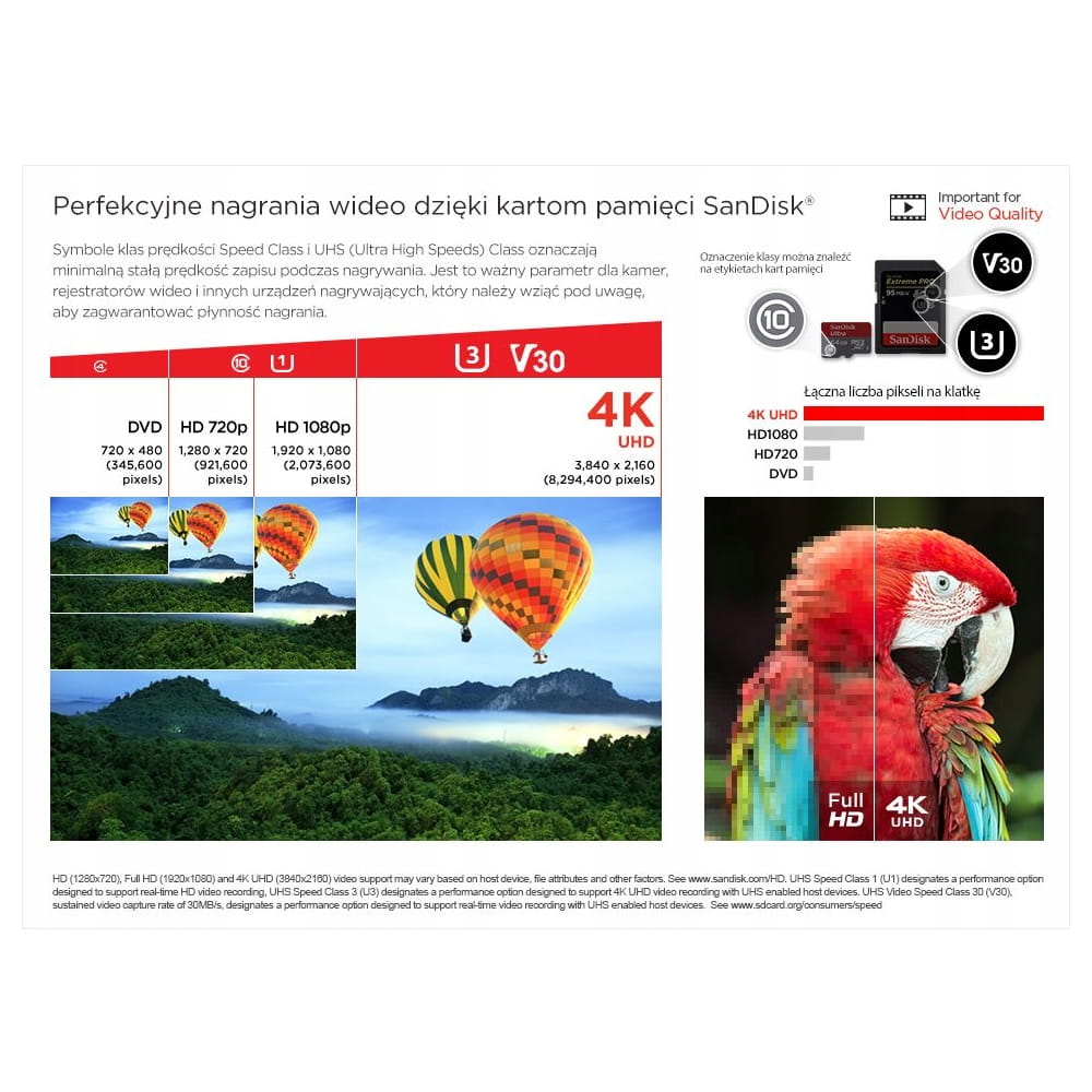 Szybkość klasy UHS-I Speed Class U3 umożliwia wysokiej jakości nagrania Full HD oraz Ultra 4K.