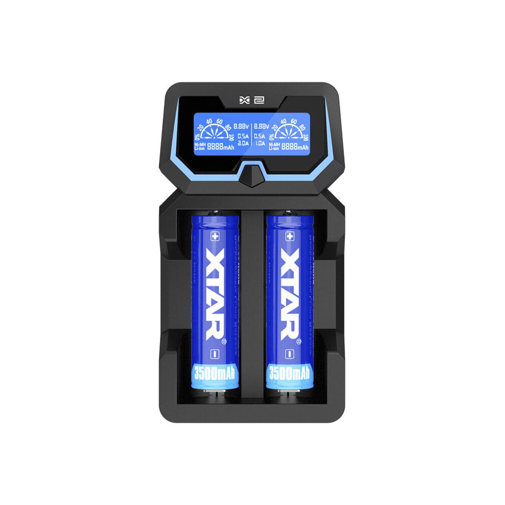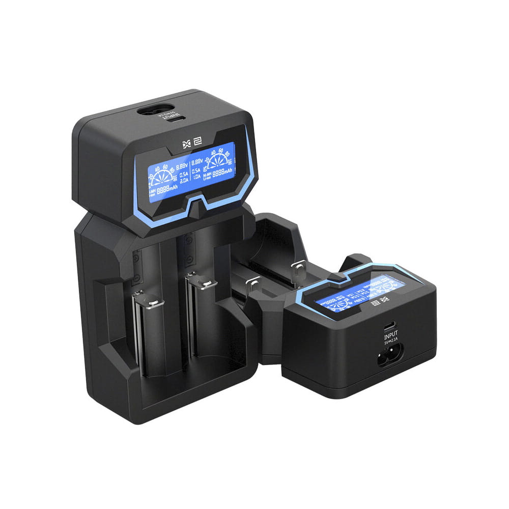 X2 to profesjonalna procesorowa ładowarka z trzystopniowym procesem ładowania TC/CC/CV i wyświetlaczem LCD. Ładuje 1-2 ogniwa Li-ion 3,6 / 3,7V oraz Ni-MH o dowolnej pojemności w rozmiarach AAA/R03, AA/R6, SUB-C/SC, R14/C, 14500, 14650, 16340, 17500, 17670, 18350, 18500, 18650, 18700, 20700, 21700, 22650, 25500, 26650.