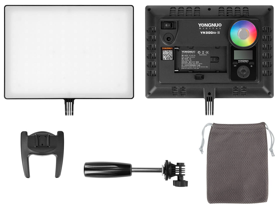 Yongnuo YN300 Air II to mocna, ale zarazem kompaktowa lampa LED z funkcją sterowania zdalnego za pomocą dołączonego pilota. Została wyposażona w diody o wysokim wskaźniku odwzorowania barw, pokrywające zakres temperatury barwowej 3200 - 5600 K i pełne spektrum RGB. Może być zasilana za pomocą akumulatora NP-F lub zasilacza sieciowego. To doskonałe i kreatywne rozwiązanie dla każdego mobilnego filmowca lub fotografa.