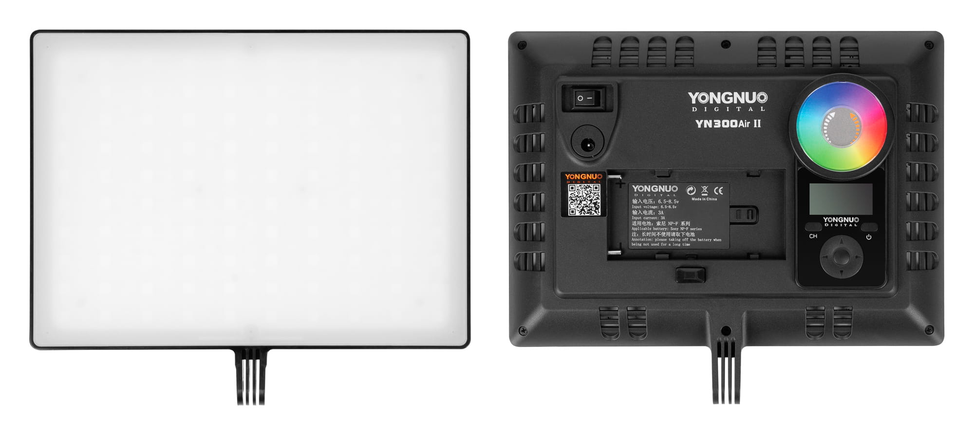 Yongnuo YN300 Air II można zasilać na dwa sposoby. W zależności od tego, czy pracujesz w studio, czy w plenerze do wyboru masz stacjonarne zasilanie sieciowe (DC 12 V / 2 A) lub mobilny akumulator z serii NP-F.