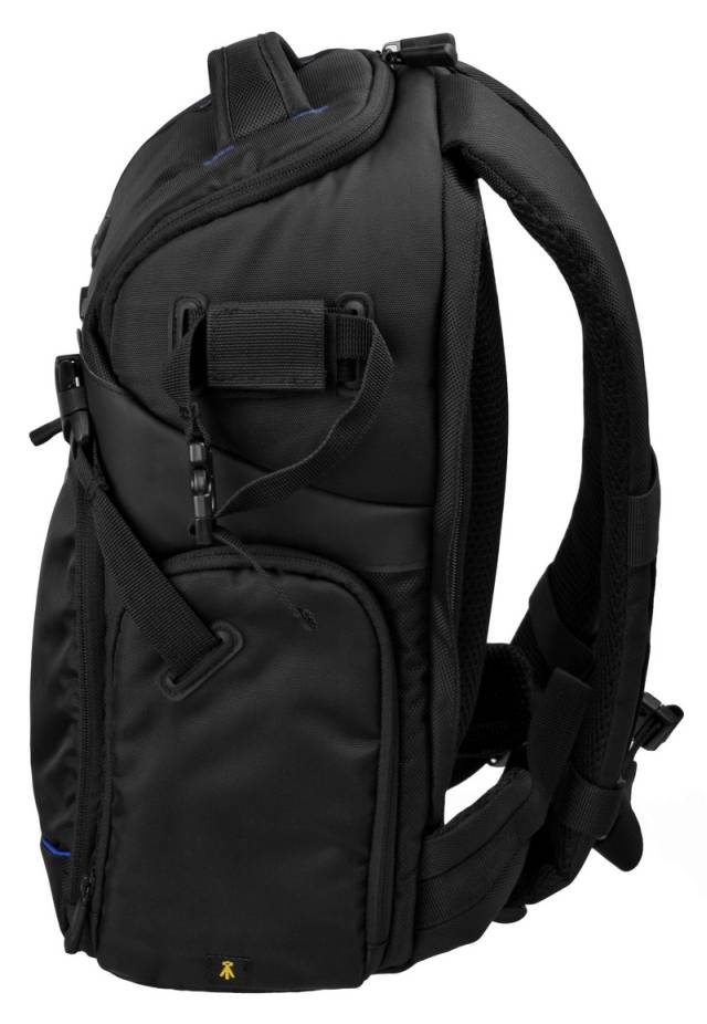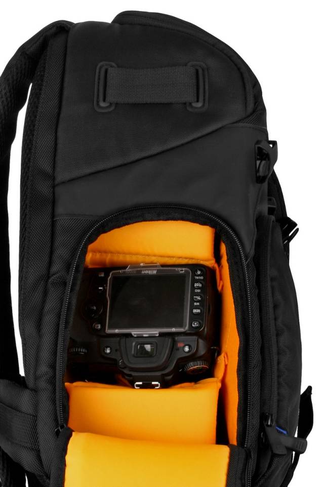 Plecak wyposażony został w wygodne, regulowanej długości szelki z pasem ściągającym na wysokości piersi oraz rączkę w górnej części. W komplecie znajduje się pasek za pomocą którego możemy przyczepić statyw z prawego lub lewego boku plecaka.