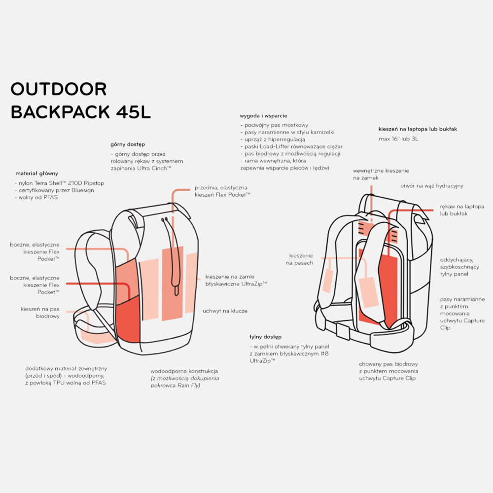 Żadne dwie wyprawy outdoorowe nie są takie same - twój sprzęt, środowisko i potrzeby zawsze się zmieniają - a Peak Design Outdoor Backpack 45L to lekki plecak z wewnętrzną ramą, zaprojektowany tak, aby poradzić sobie z tym wszystkim bez zmuszania cię do poświęceń. Od wyjątkowo wygodnego systemu uprzęży, przez duże, piękne punkty dostępu, po całkowicie konfigurowalną organizację wewnętrzną i zewnętrzną, PD Outdoor Backpack 45L zawiera mnóstwo innowacyjnych funkcji, które po prostu działają, dzięki czemu możesz spędzać więcej czasu na świeżym powietrzu, a mniej na zmaganiu się ze sprzętem. Zaprojektowany do współpracy z szeroką gamą narzędzi do pakowania Peak Design*, które pozwalają wybrać ochronę i organizację dla dowolnej kombinacji odzieży, prowiantu, sprzętu kempingowego, sprzętu sportowego i sprzętu fotograficznego - od pojedynczego aparatu / obiektywu po pełną profesjonalną konfigurację kreatywną.