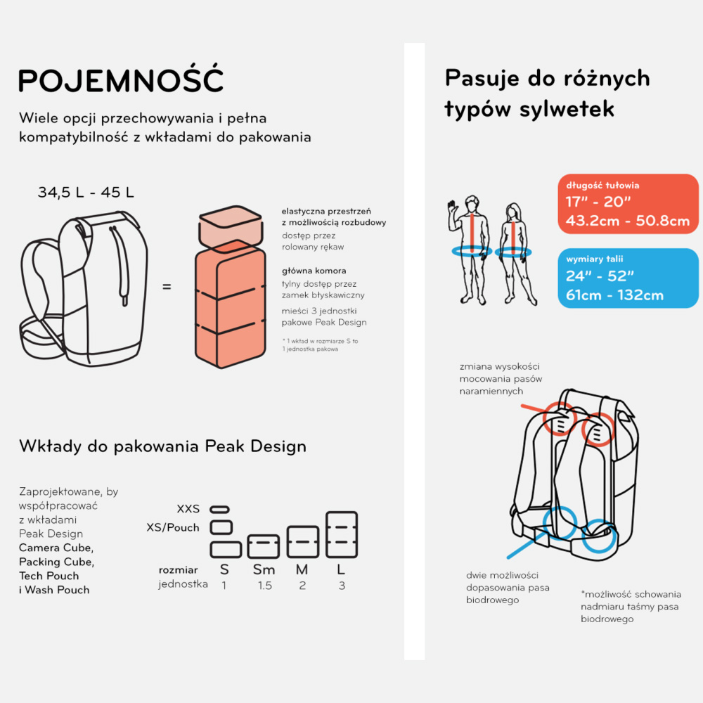 Inne unikalne funkcje obejmują opatentowany punkt dostępu Ultra Cinch ™ do łatwego pakowania i rozpakowywania, który umożliwia błyskawiczny dostęp jedną ręką i rozszerzenie o 10,5 l. Ogromny tylny panel dostępu sprawia, że pakowanie jest dziecinnie proste, a także zapewnia idealny format do przenoszenia aparatu na zewnątrz za pomocą Peak Design Camera Cubes *, które bezpiecznie zatrzaskują się wewnątrz torby. 5 masywnych zewnętrznych kieszeni Flex Pockets™ zapewnia szybki dostęp do przechowywania dużych przedmiotów (butelek z wodą, kijków turystycznych, kurtek, statywów), ale zawsze zachowuje czysty profil, nigdy nie wyglądając na niechlujne lub potargane. Zewnętrzne linki transportowe Cord Hook™ i elastyczne pętle Gear Loops zapewniają nieskończone możliwości mocowania rzeczy na zewnątrz plecaka, a Cord Rails™ zapewniają 360-stopniowe punkty mocowania. Możesz nawet dołączyć kostki Peak Design Ultralight Packing Cubes* do modułowego przechowywania zewnętrznego. Certyfikat Fair Trade i 100% neutralności węglowej.