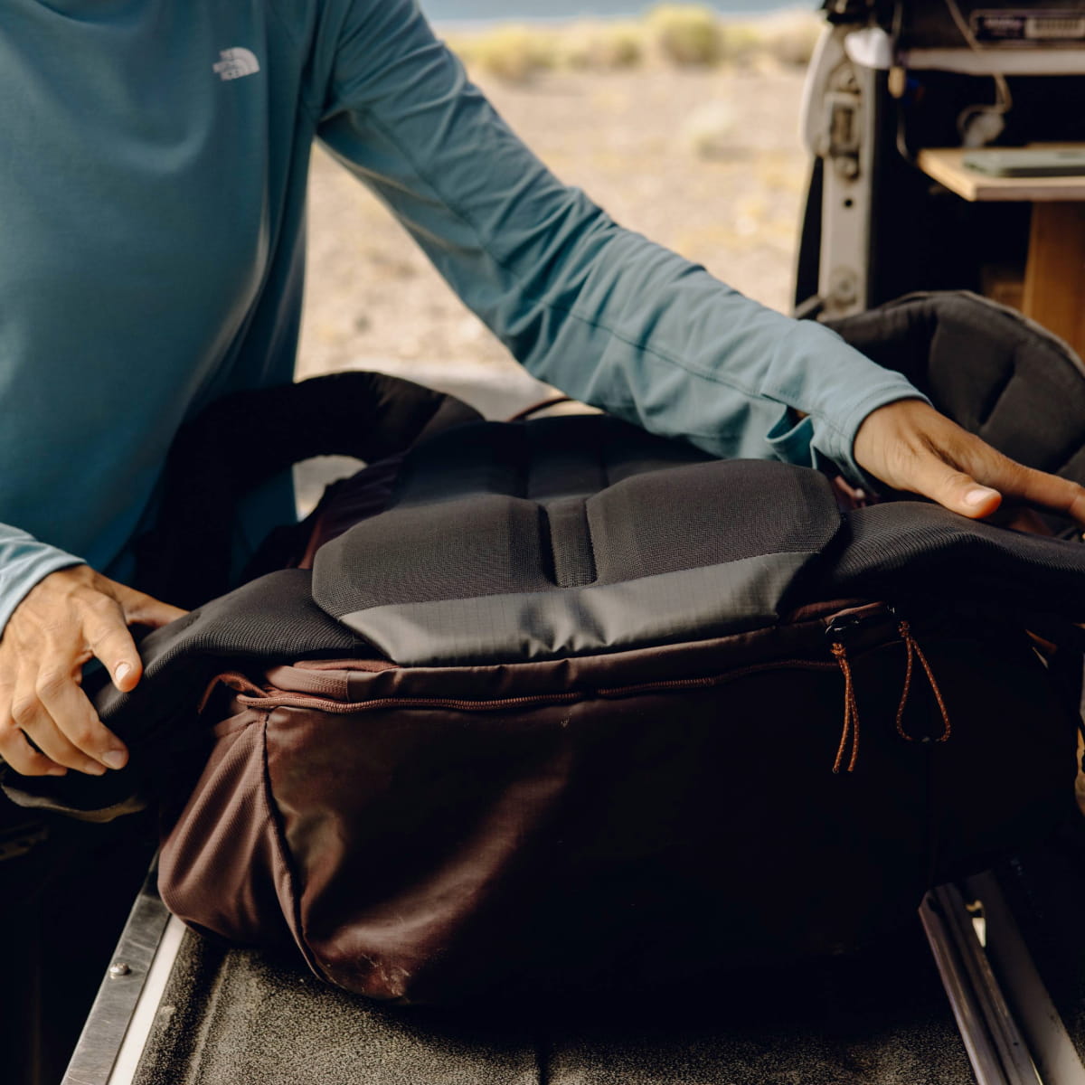 Pasuje do dużej kostki na aparat. Zaprojektowany z myślą o ciężkich jednodniowych przygodach lub lekkim nocnym użytkowaniu. Potrzebujesz czegoś mniejszego? Wypróbuj plecak Outdoor Backpack 25L.