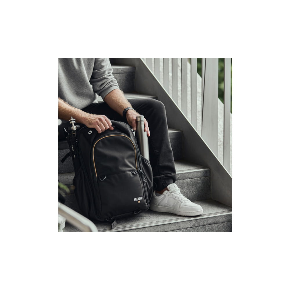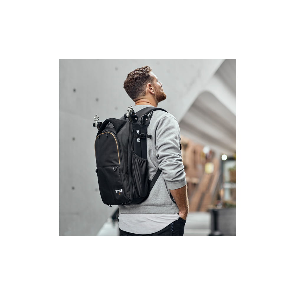 Wykonany jest z wysokiej jakości materiałów, w tym miękkiej, wytrzymałej rączki z Alcantary®, ramiączek z nylonu balistycznego i wodoodpornej części zewnętrznej. Jest solidny i wytrzymały. Może pomieścić RØDECaster Pro lub Pro II, a także mikrofony, ramiona studyjne i inne akcesoria, jak też laptopy o przekątnej do 16 cali. Ergonomiczne regulowane paski na ramiona z podparciem pleców i klatki piersiowej zapewniają absolutny komfort, a zewnętrzne kieszenie i przegródki zapewniają dodatkowe miejsce do przechowywania.