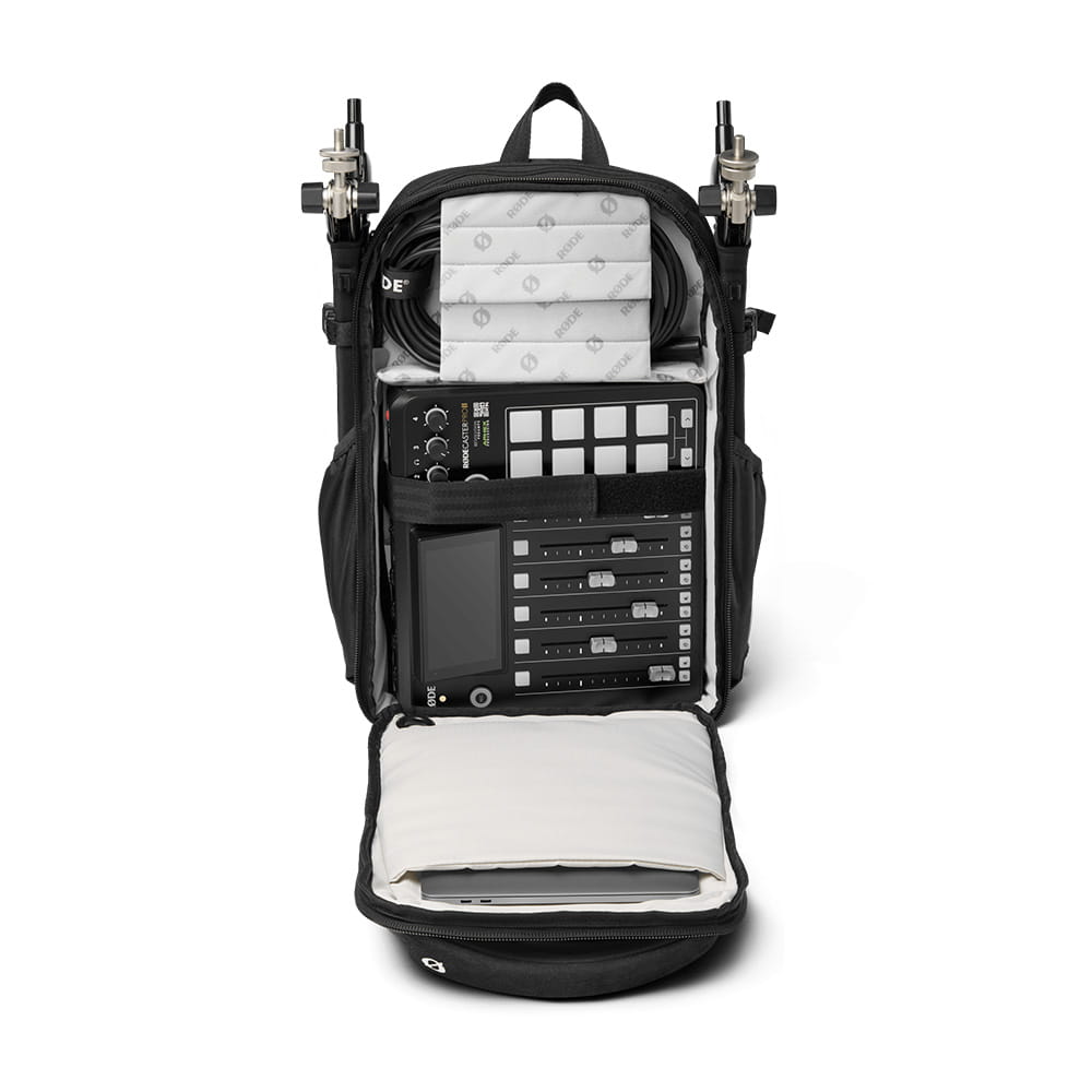 Plecak RØDE to zaprojektowana na zamówienie torba transportowa dla serii zintegrowanych studiów produkcji podcastów RØDECaster, w tym RØDECaster Pro i RØDECaster Pro II.