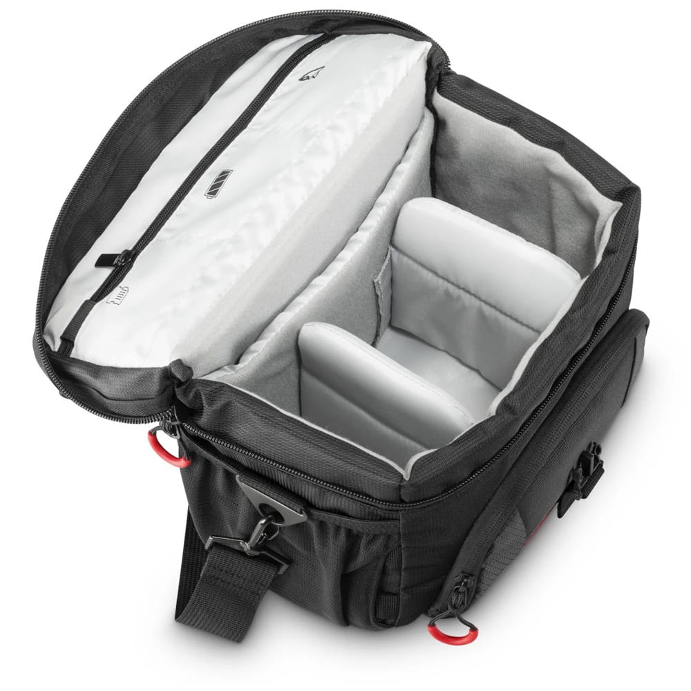 - Płaska przednia kieszeń z dwoma siatkowymi przegrodami, np. na baterie